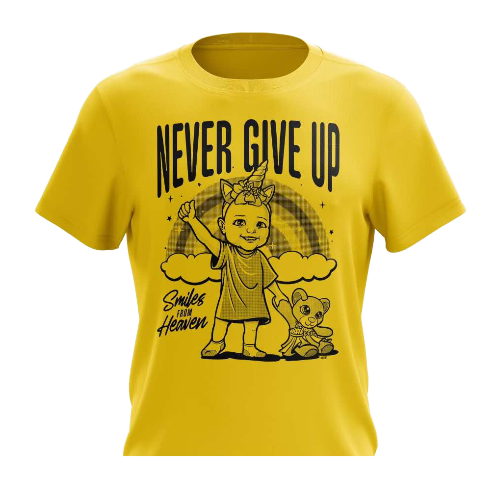 Discover the SFH Never Give Up Shirt, a symbol of strength and hope for families affected by pediatric cancer. Crafted from Gold Sport-Tek Dri-Tech Cool Tee material, this navy blue shirt offers maximum comfort and sweat control with its lightweight and roomy athletic cut. Made from 3.8-ounce, 100% moisture-wicking polyester, it features a removable tag for added comfort and double-needle sleeves and hem for durability. Unisex and stylish, this shirt not only supports Smiles From Heaven’s mission but also stands as a testament to resilience with the #BellaStrong spirit. Wear it with pride and make a difference.