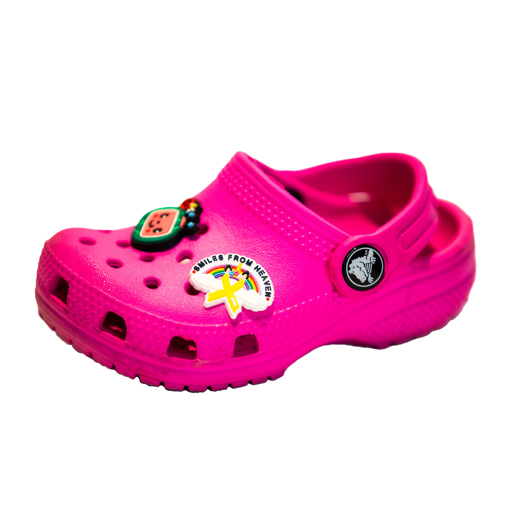 Embrace the spirit of resilience with our Smiles From Heaven Croc Charm. A beautiful Croc Charm that brings HOPE and serves as a reminder to keep fighting! Every purchase not only adorns your favorite footwear with a symbol of perseverance but also supports children and families affected by pediatric cancer. Join us in spreading positivity and strength—because together, we are #BellaStrong.